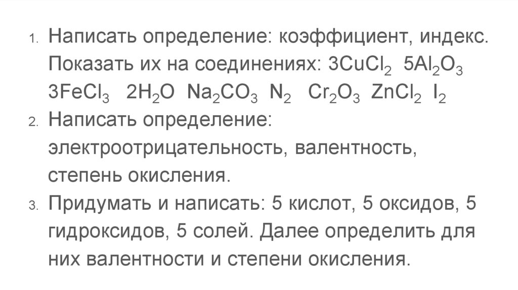 1. Написать определение: коэффициент, индекс.Показать их на соединениях: 3CuCl2 5Al2O3