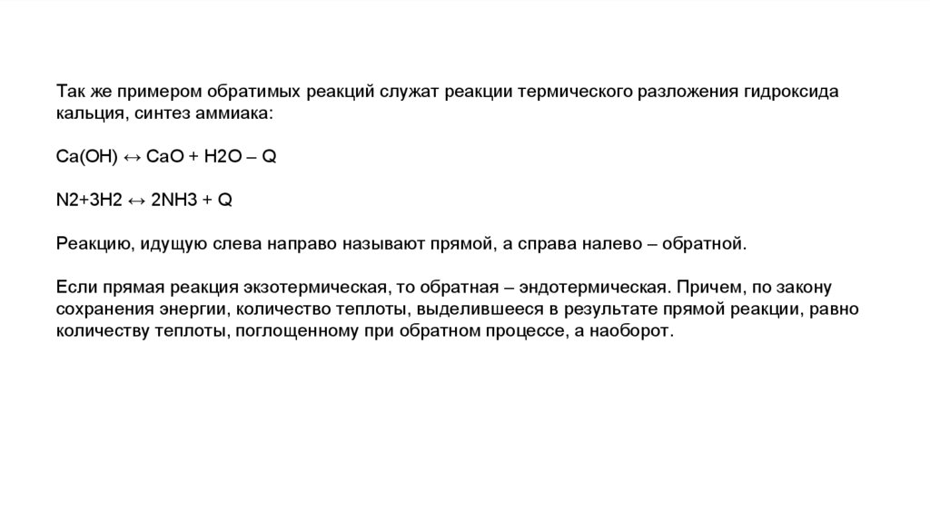 Так же примером обратимых реакций служат реакции термического разложения гидроксидакальция, синтез аммиака: