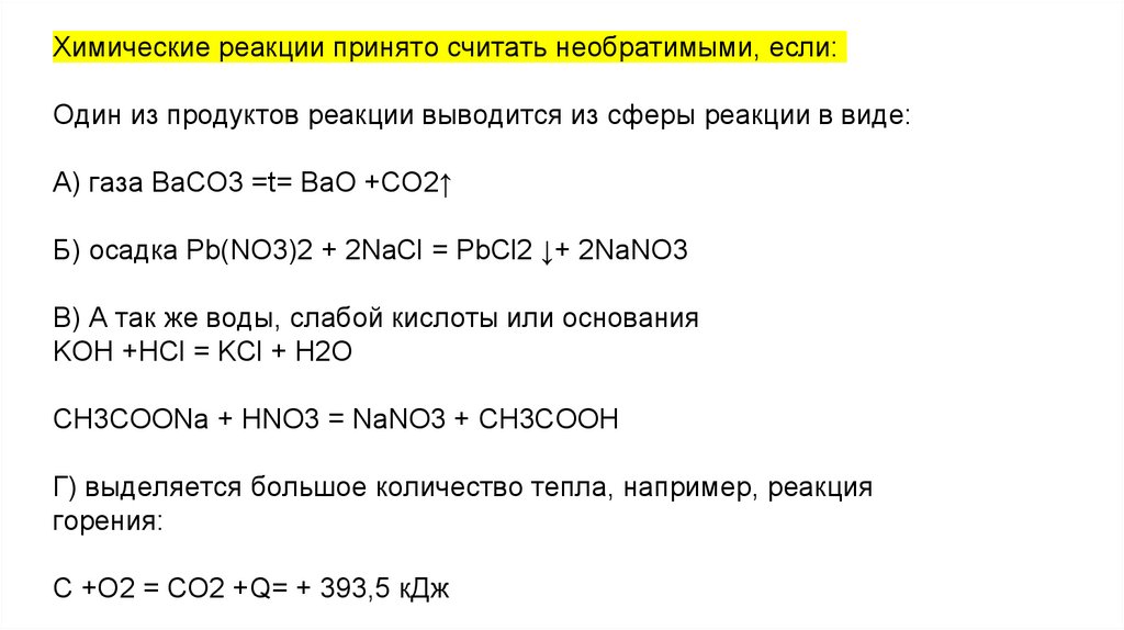 Химические реакции принято считать необратимыми, если:Один из продуктов реакции выводится из сферы реакции в виде: