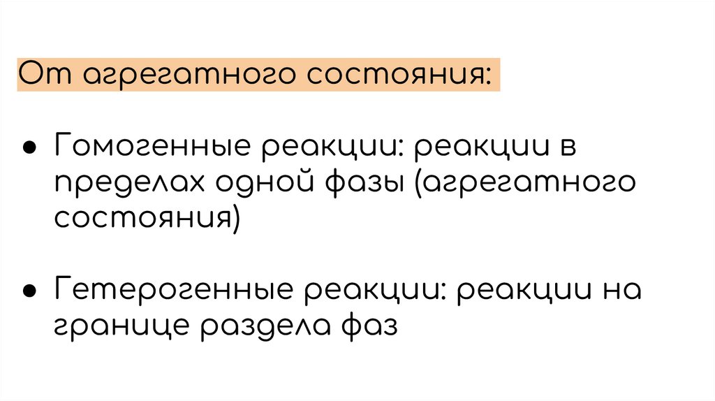 От агрегатного состояния:● Гомогенные реакции: реакции в