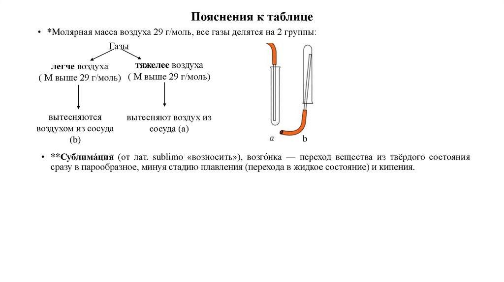 Пояснения к таблице• *Mолярная масса воздуха 29 г/моль, все газы делятся на 2 группы: