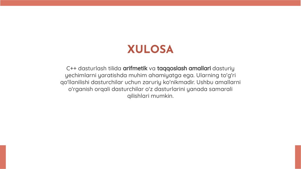 XULOSAC++ dasturlash tilida arifmetik va taqqoslash amallari dasturiy