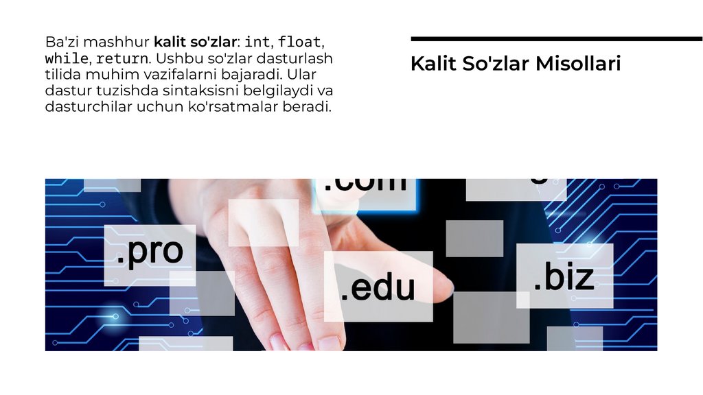 Ba'zi mashhur kalit so'zlar: int, float,while, return. Ushbu so'zlar dasturlash
