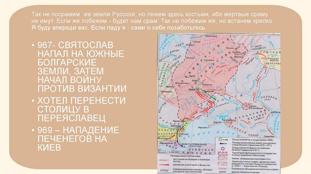 Так не посрамим же земли Русской, но ляжем здесь костьми, ибо мертвые срамуне имут. Если же побежим - будет нам срам. Так не побежим же, но встанем крепко.