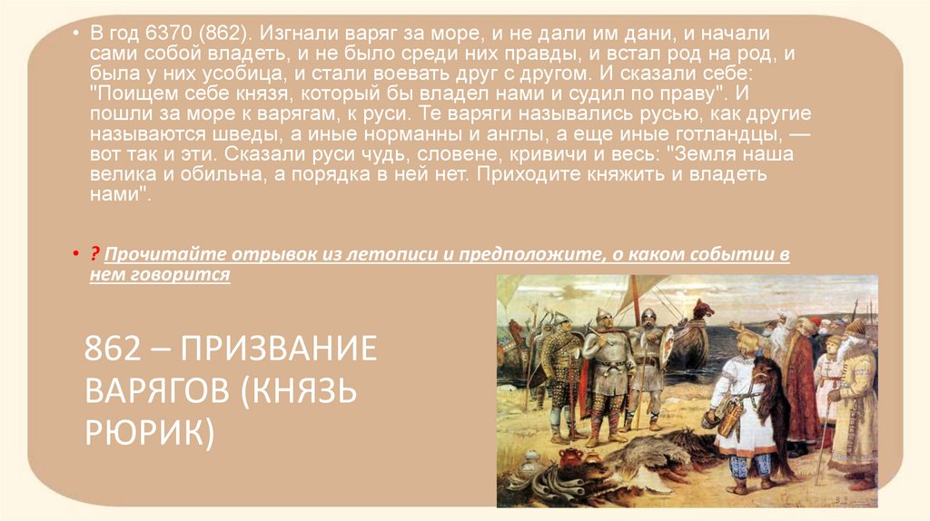 • В год 6370 (862). Изгнали варяг за море, и не дали им дани, и началисами собой владеть, и не было среди них правды, и встал род на род, и