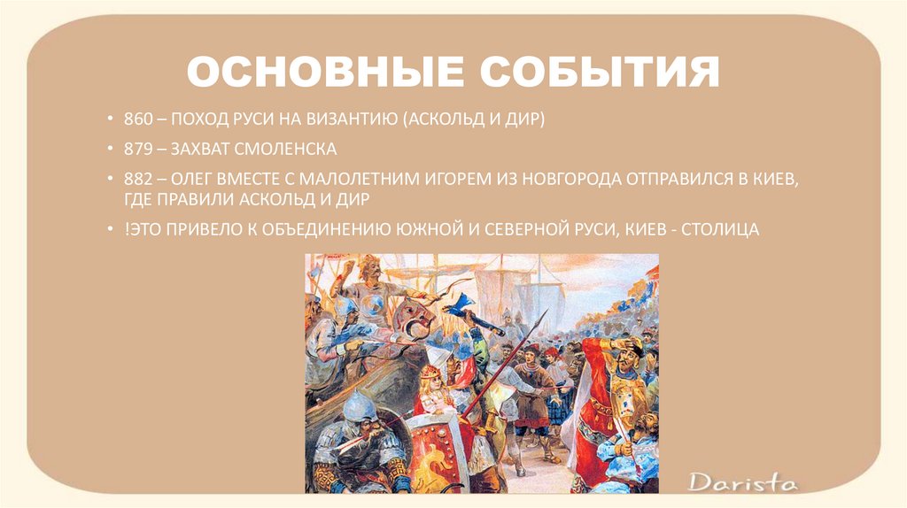 ОСНОВНЫЕ СОБЫТИЯ• 860 – ПОХОД РУСИ НА ВИЗАНТИЮ (АСКОЛЬД И ДИР)