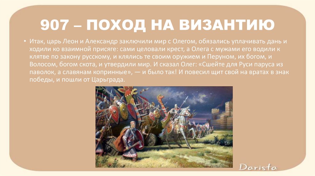 907 – ПОХОД НА ВИЗАНТИЮ• Итак, царь Леон и Александр заключили мир с Олегом, обязались уплачивать дань и