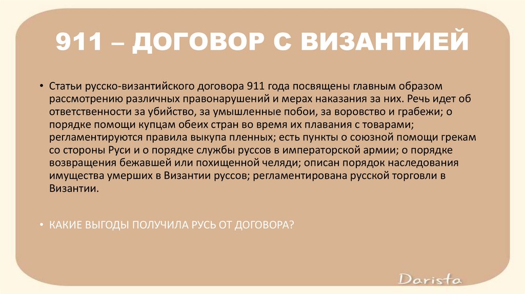 911 – ДОГОВОР С ВИЗАНТИЕЙ• Статьи русско-византийского договора 911 года посвящены главным образом