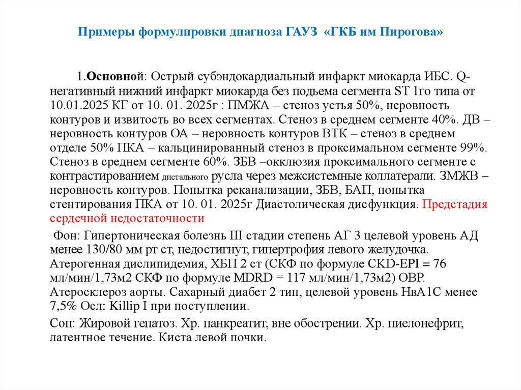 Примеры формулировки диагноза ГАУЗ «ГКБ им Пирогова»1.Основной: Острый субэндокардиальный инфаркт миокарда ИБС. Qнегативный нижний инфаркт миокарда без подьема сегмента ST 1го типа от