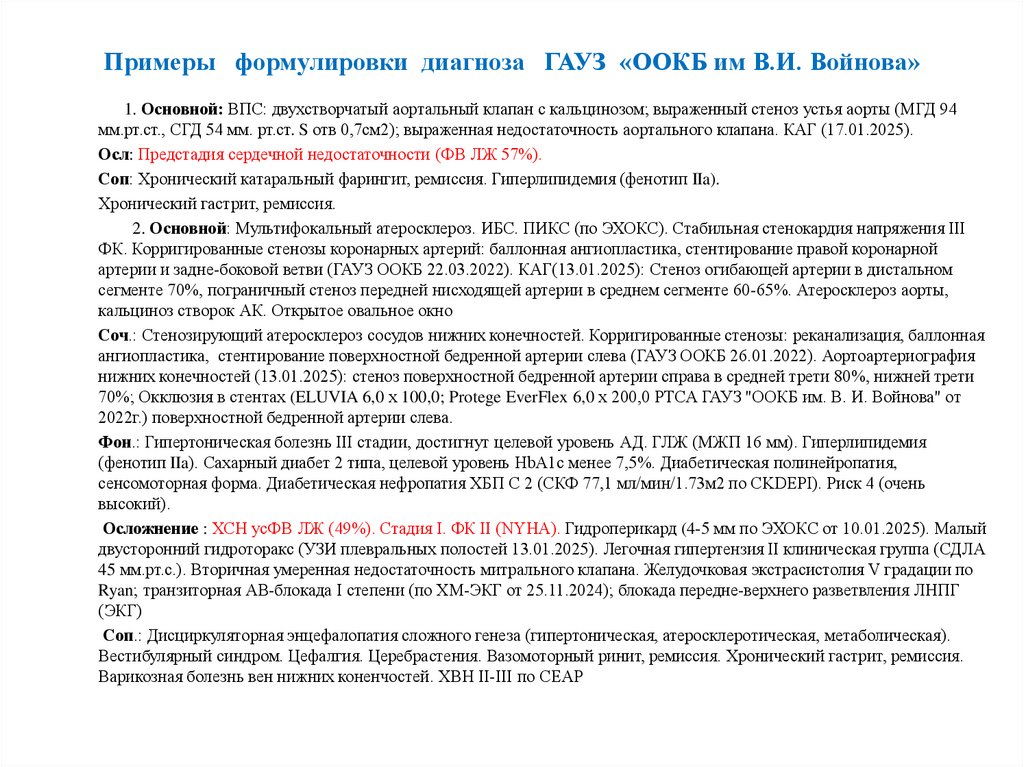 Примеры формулировки диагноза ГАУЗ «ООКБ им В.И. Войнова»1. Основной: ВПС: двухстворчатый аортальный клапан с кальцинозом; выраженный стеноз устья аорты (МГД 94