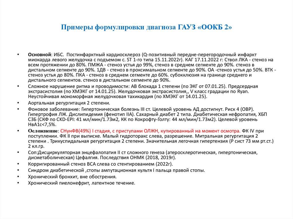 Примеры формулировки диагноза ГАУЗ «ООКБ 2»Основной: ИБС. Постинфарктный кардиосклероз (Q-позитивный передне-перегородочный инфаркт