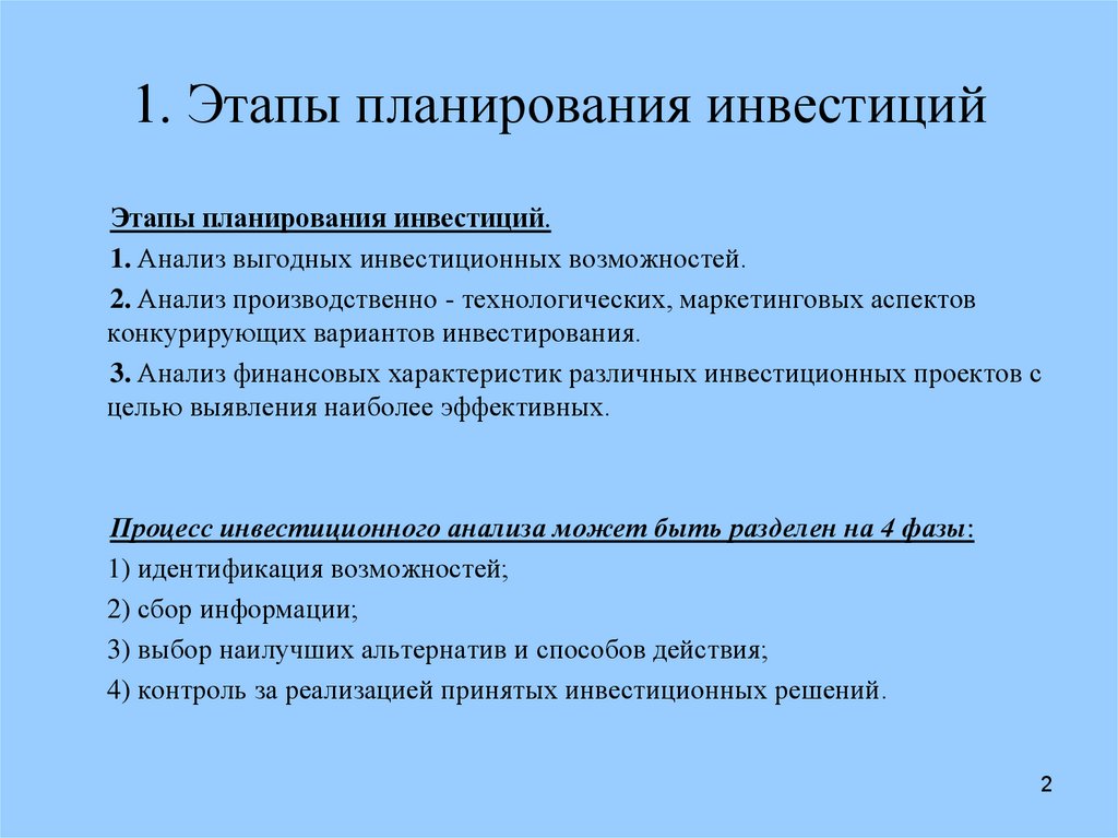 1. Этапы планирования инвестицийЭтапы планирования инвестиций.