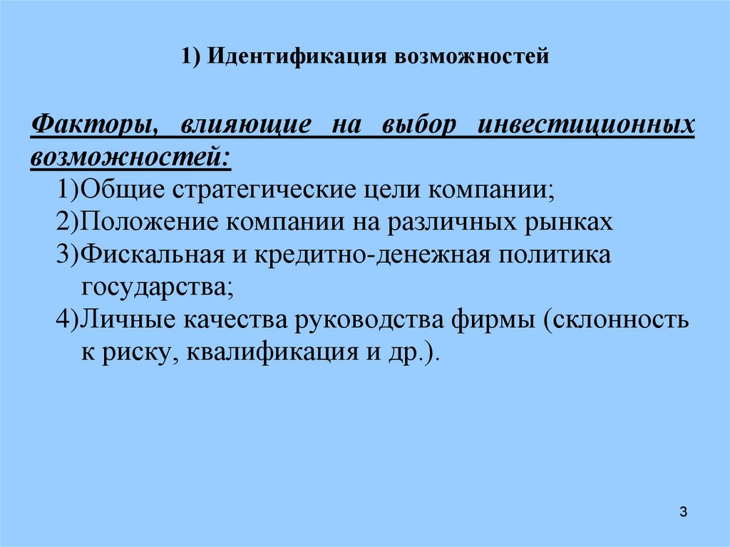 1) Идентификация возможностейФакторы, влияющие на выбор инвестиционных