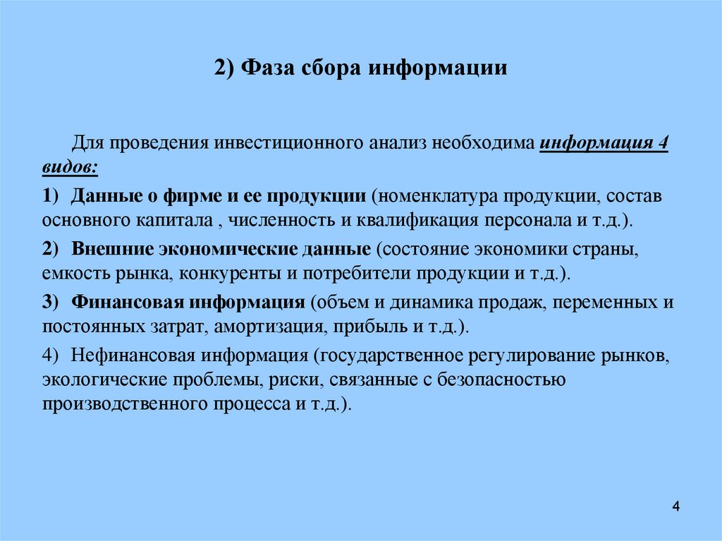 2) Фаза сбора информацииДля проведения инвестиционного анализ необходима информация 4