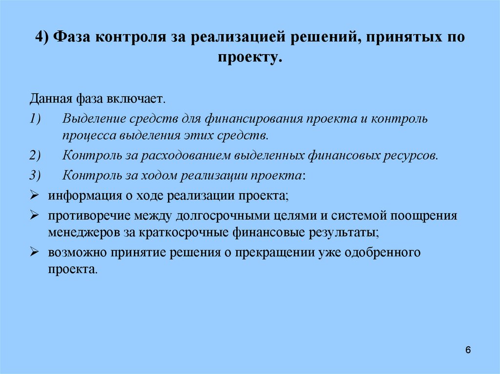 4) Фаза контроля за реализацией решений, принятых попроекту.