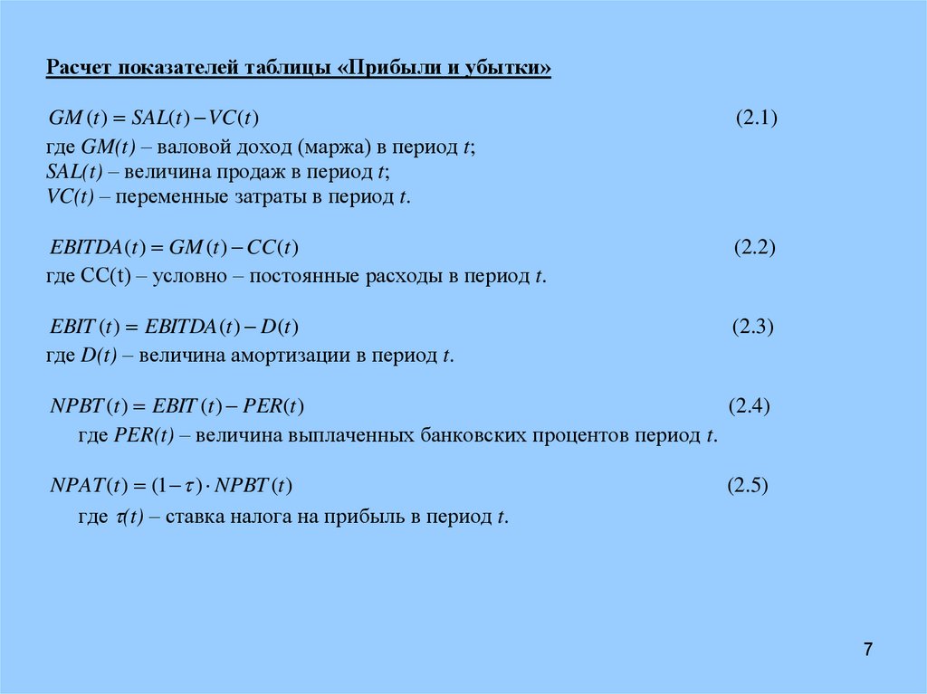 Расчет показателей таблицы «Прибыли и убытки»GM (t ) SAL(t ) VC (t )