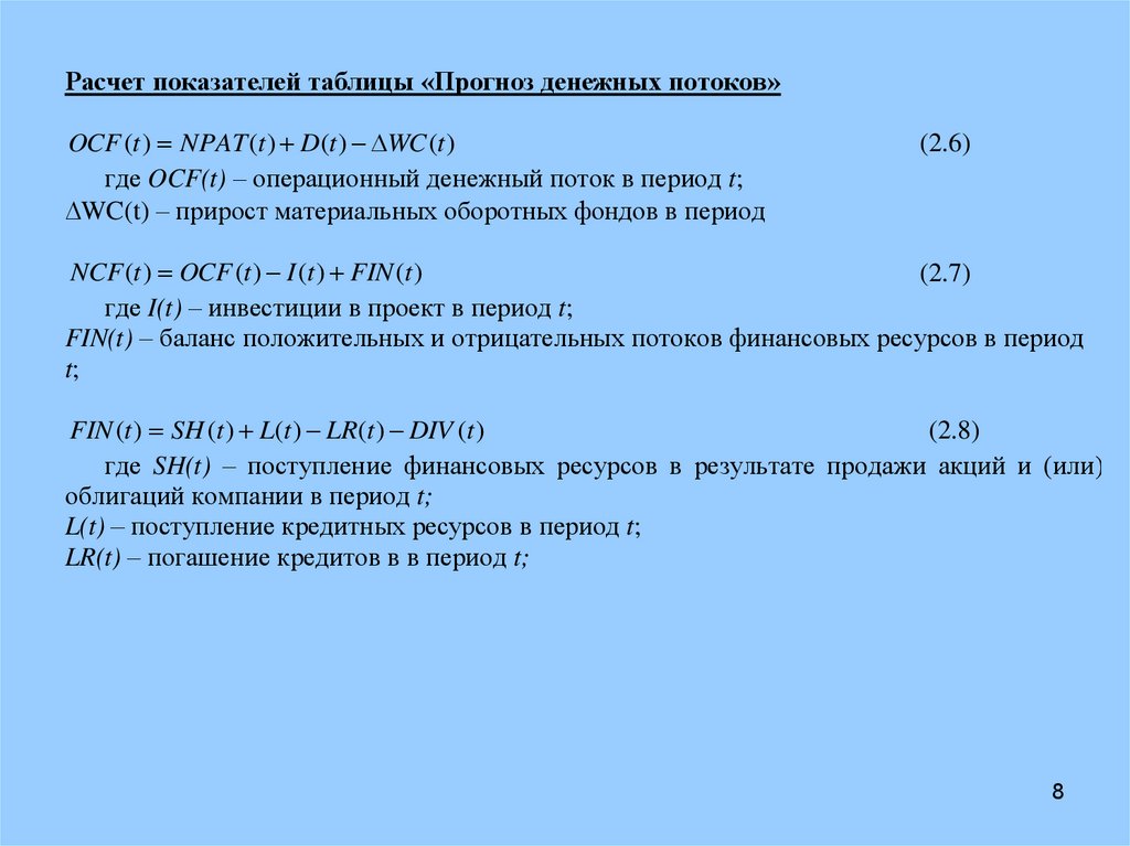 Расчет показателей таблицы «Прогноз денежных потоков»OCF (t ) NPAT (t ) D(t ) WC (t )