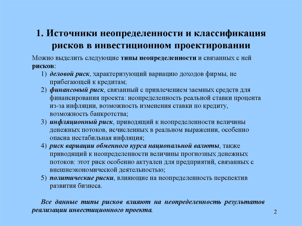 1. Источники неопределенности и классификациярисков в инвестиционном проектировании