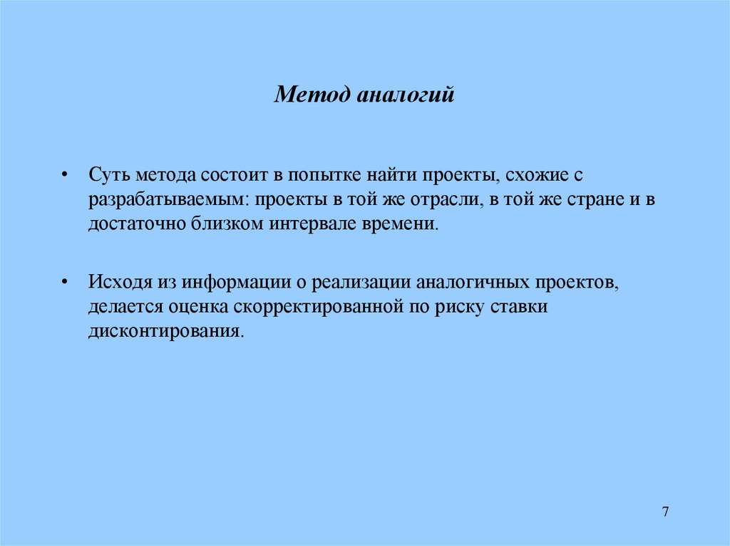 Метод аналогий• Суть метода состоит в попытке найти проекты, схожие с