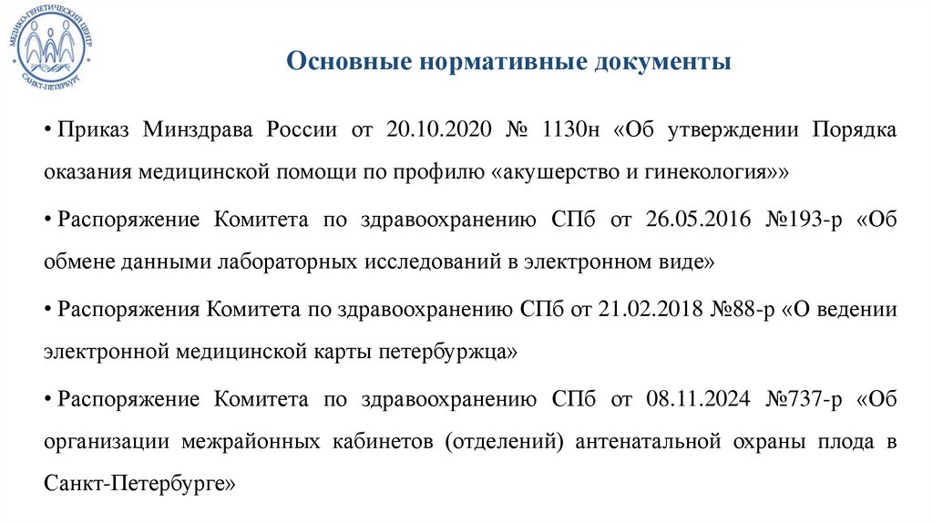 Основные нормативные документы• Приказ Минздрава России от 20.10.2020 № 1130н «Об утверждении Порядка