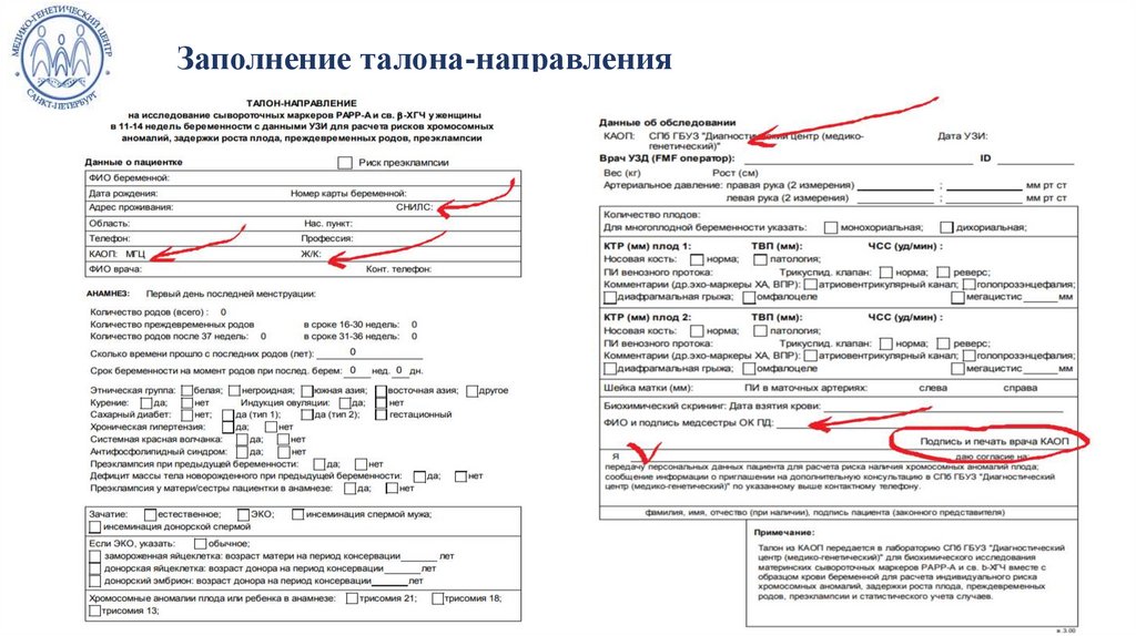 • направление образцов крови и результатов УЗИ, внесенных в талон –