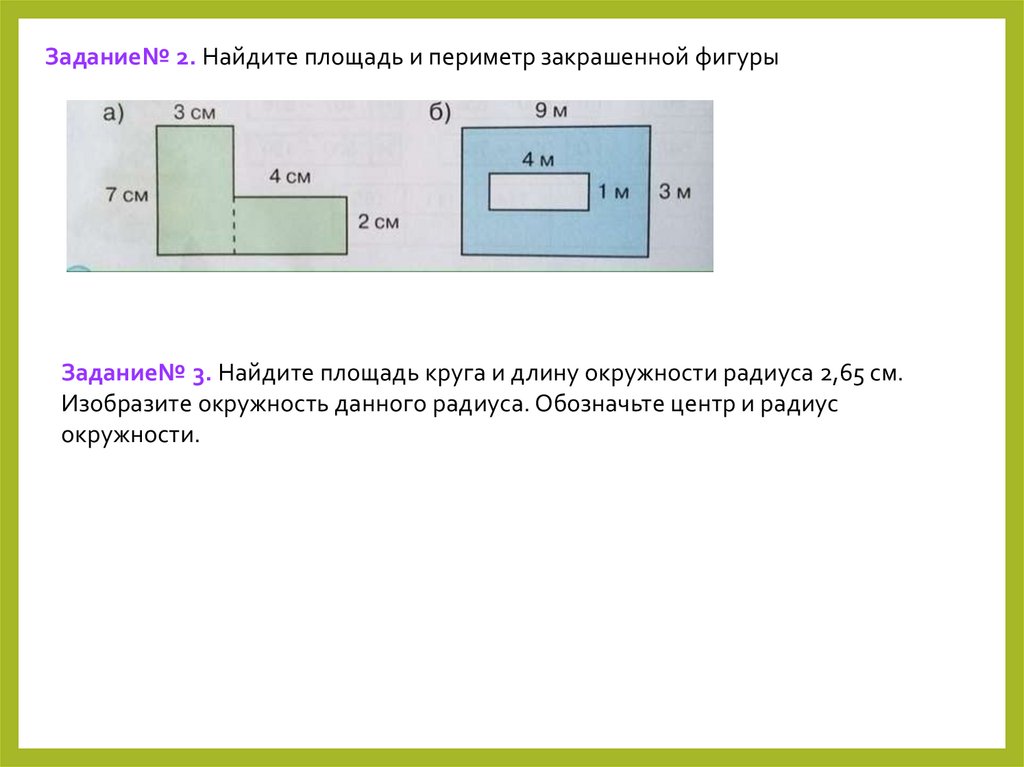 Задание№ 2. Найдите площадь и периметр закрашенной фигурыЗадание№ 3. Найдите площадь круга и длину окружности радиуса 2,65 см.