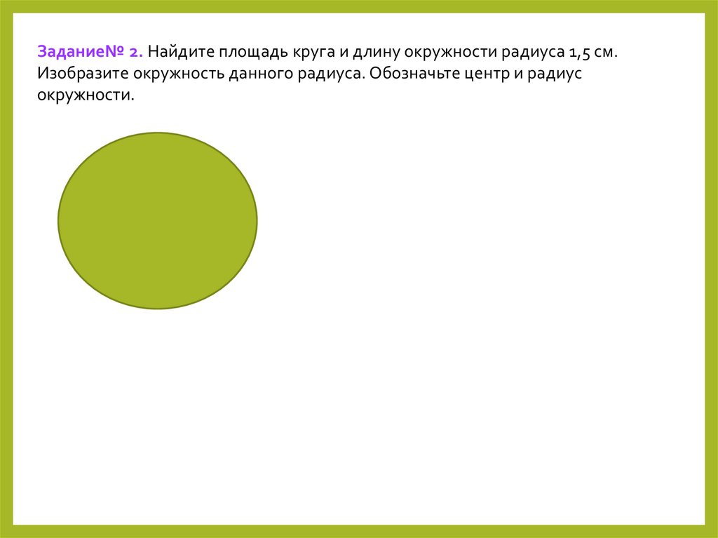 Задание№ 2. Найдите площадь круга и длину окружности радиуса 1,5 см.Изобразите окружность данного радиуса. Обозначьте центр и радиус