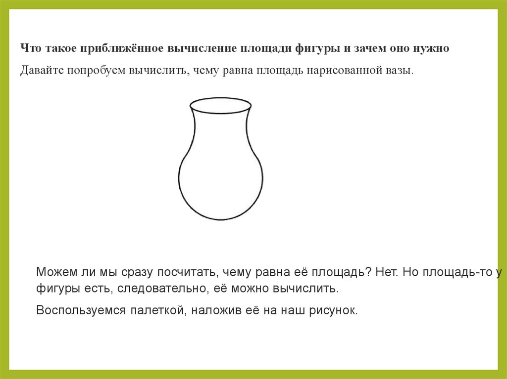 Что такое приближённое вычисление площади фигуры и зачем оно нужноДавайте попробуем вычислить, чему равна площадь нарисованной вазы.