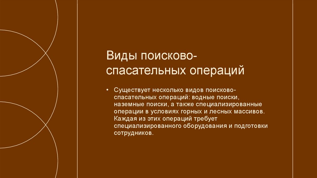 Виды поисковоспасательных операций• Существует несколько видов поисковоспасательных операций: водные поиски,