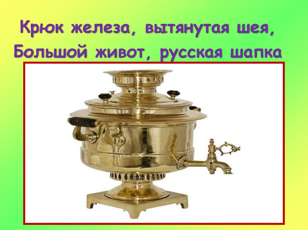 Крюк железа, вытянутая шея,Большой живот, русская шапка