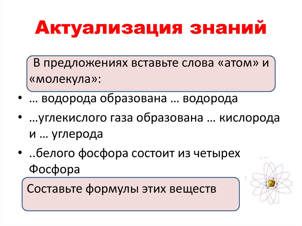 Актуализация знанийВ предложениях вставьте слова «атом» и