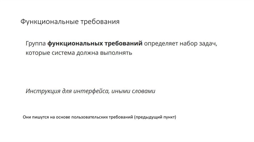 Функциональные требованияОни пишутся на основе пользовательских требований (предыдущий пункт)