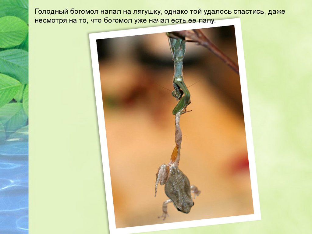 Голодный богомол напал на лягушку, однако той удалось спастись, даженесмотря на то, что богомол уже начал есть ее лапу.