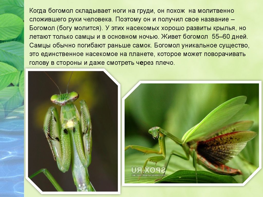 Когда богомол складывает ноги на груди, он похож на молитвенносложившего руки человека. Поэтому он и получил свое название –
