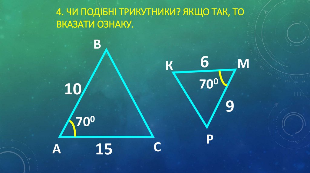 4. ЧИ ПОДІБНІ ТРИКУТНИКИ? ЯКЩО ТАК, ТОВКАЗАТИ ОЗНАКУ.