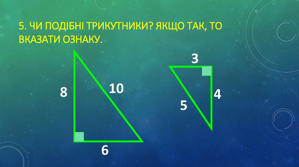 5. ЧИ ПОДІБНІ ТРИКУТНИКИ? ЯКЩО ТАК, ТОВКАЗАТИ ОЗНАКУ.