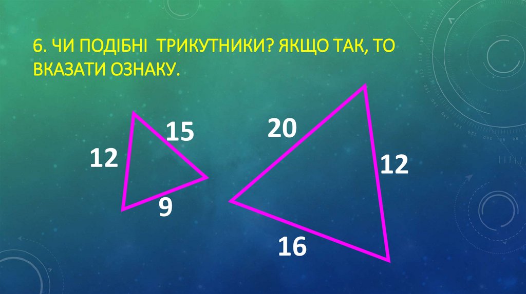 6. ЧИ ПОДІБНІ ТРИКУТНИКИ? ЯКЩО ТАК, ТОВКАЗАТИ ОЗНАКУ.