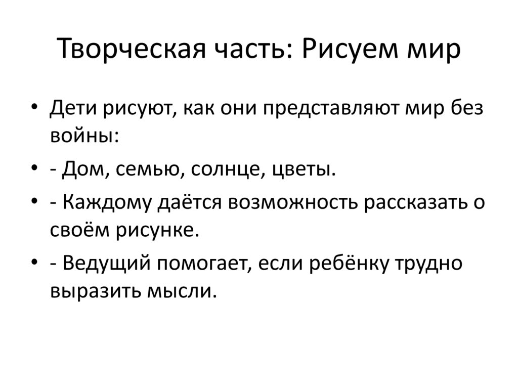 Творческая часть: Рисуем мир• Дети рисуют, как они представляют мир без