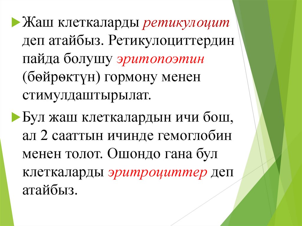 Жаш клеткаларды ретикулоцитдеп атайбыз. Ретикулоциттердин