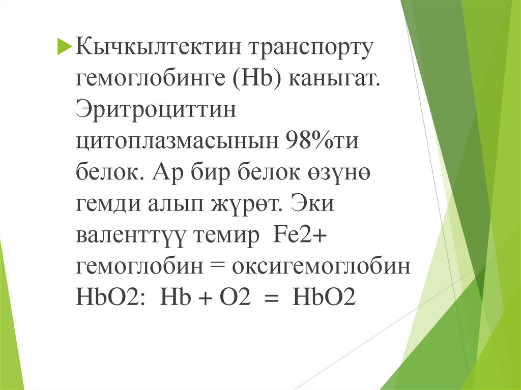 Кычкылтектин транспортугемоглобинге (Hb) каныгат.