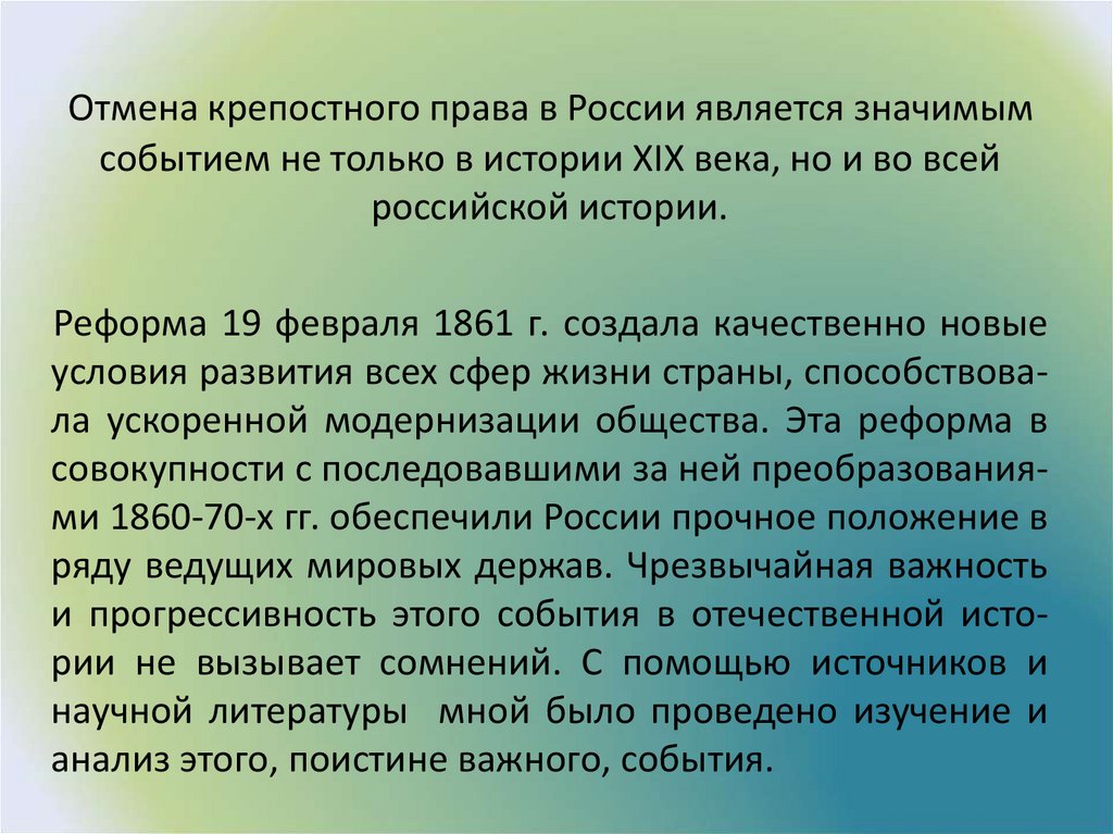 Отмена крепостного права в России является значимымсобытием не только в истории XIX века, но и во всей