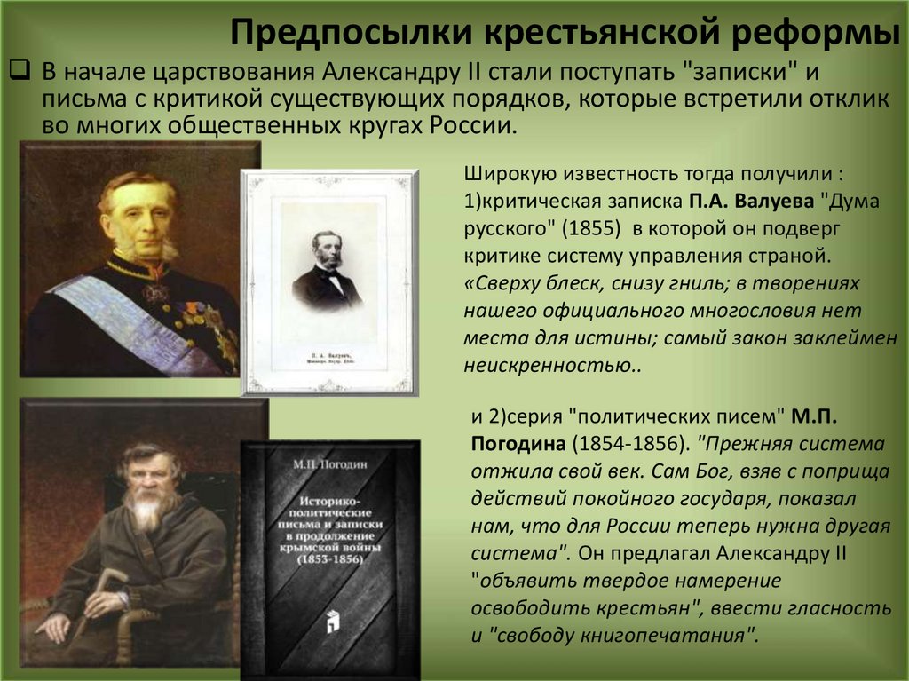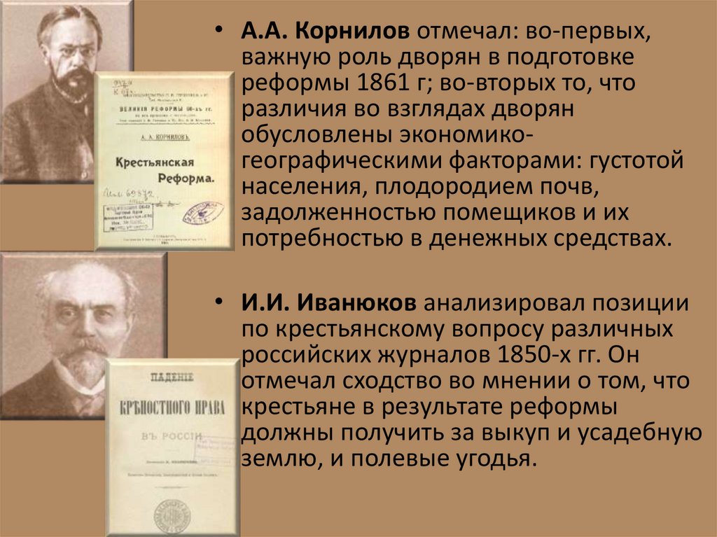 • А.А. Корнилов отмечал: во-первых,важную роль дворян в подготовке