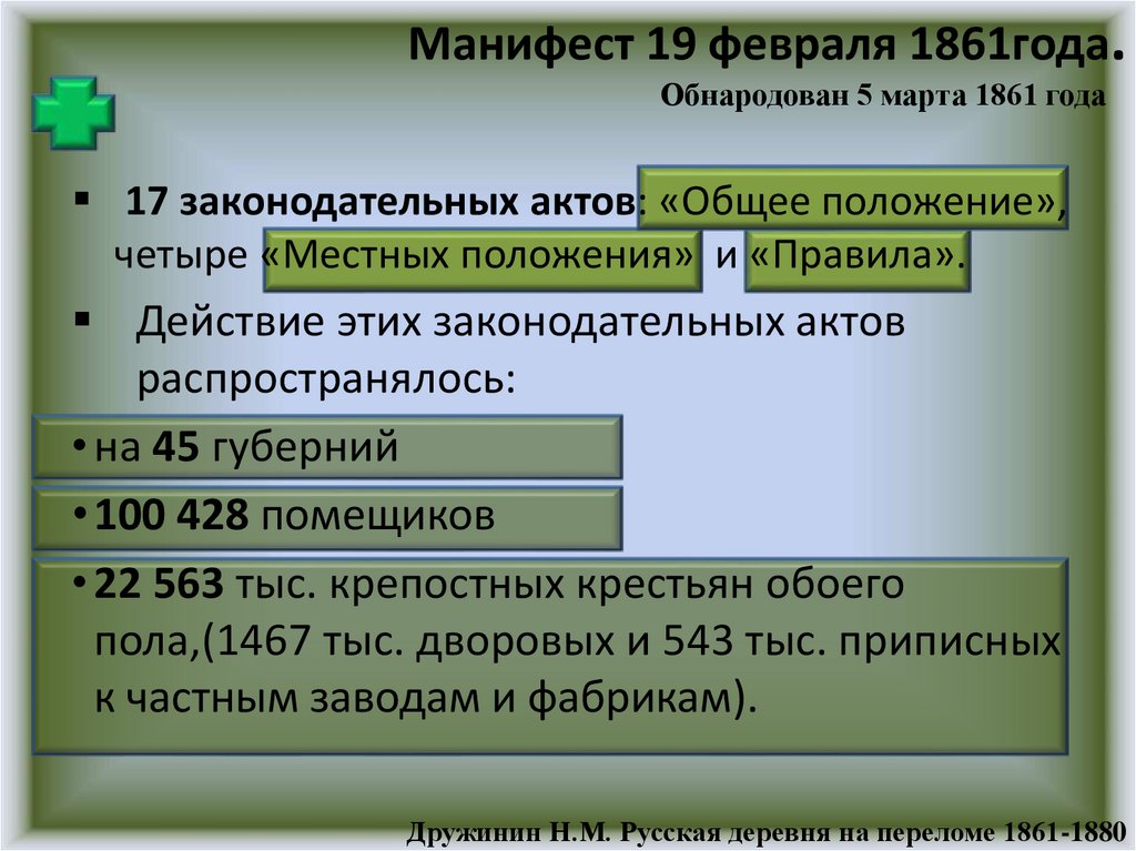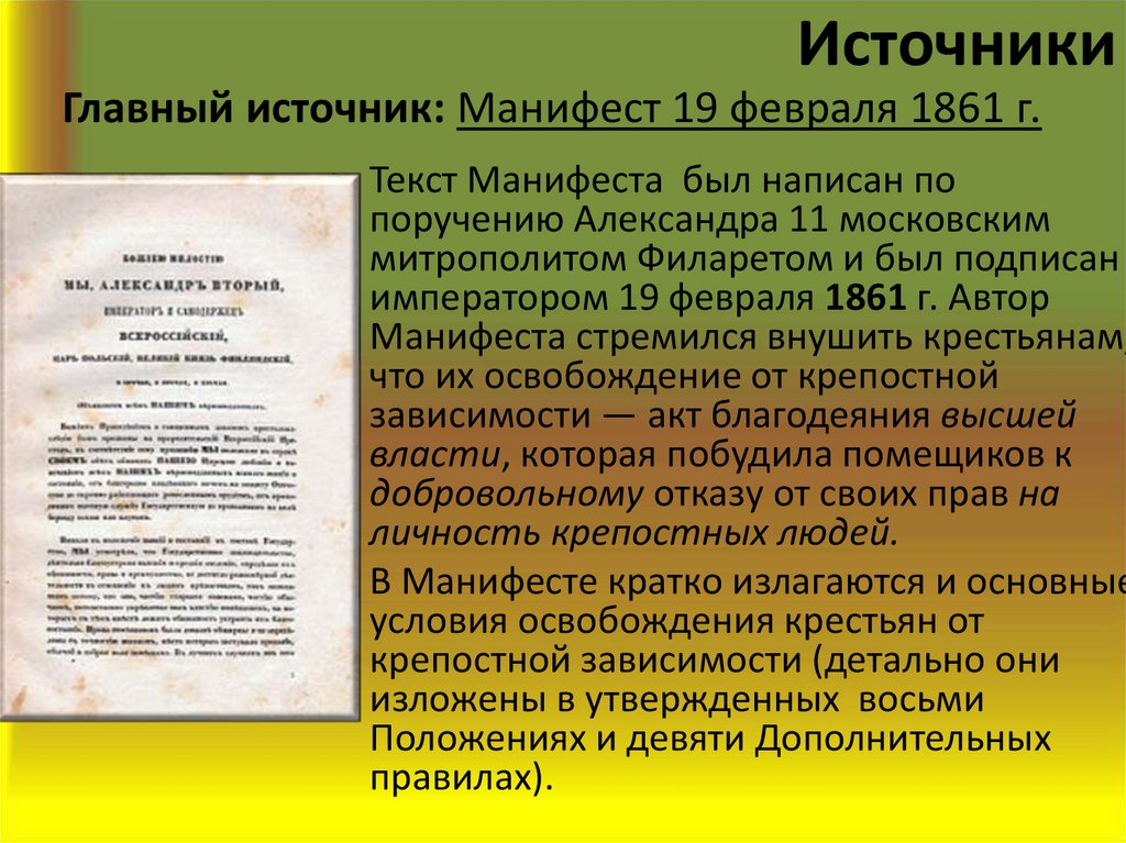 Главный источник: Манифест 19 февраля 1861 г.• Текст Манифеста был написан по