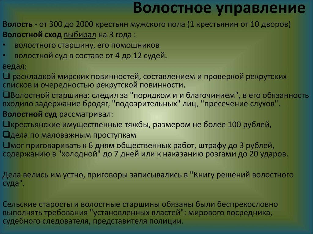 Волость - от 300 до 2000 крестьян мужского пола (1 крестьянин от 10 дворов)Волостной сход выбирал на 3 года :