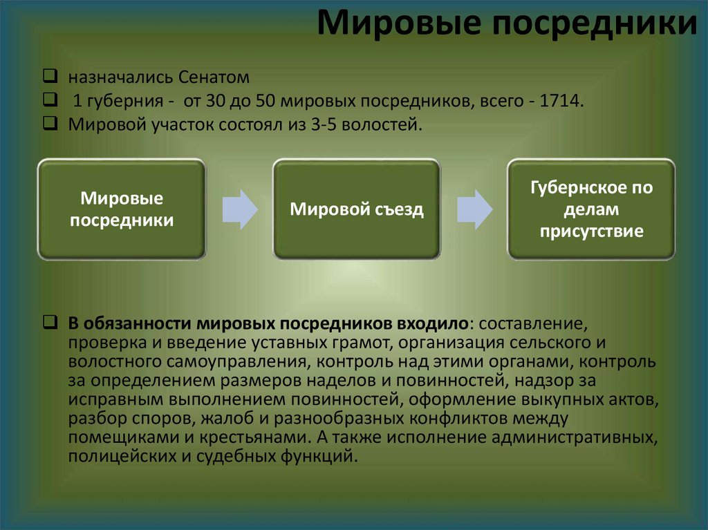 назначались Сенатом1 губерния - от 30 до 50 мировых посредников, всего - 1714.