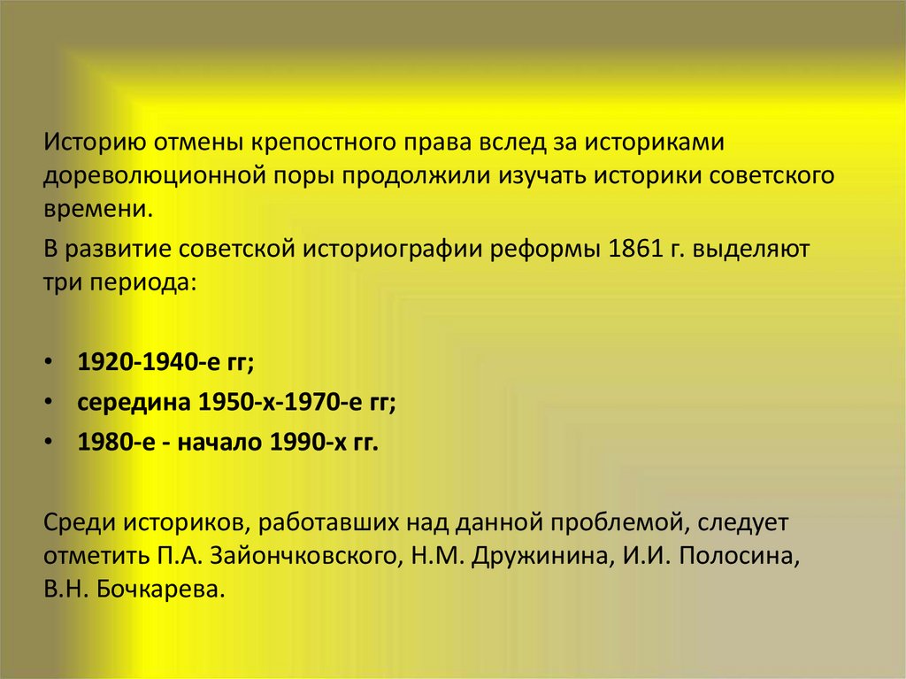 Историю отмены крепостного права вслед за историкамидореволюционной поры продолжили изучать историки советского