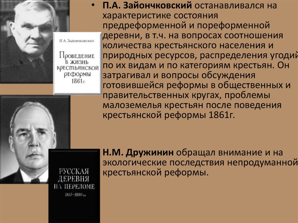 отметить П.А. Зайончковского, Н.М. Дружинина, И.И. Полосина,