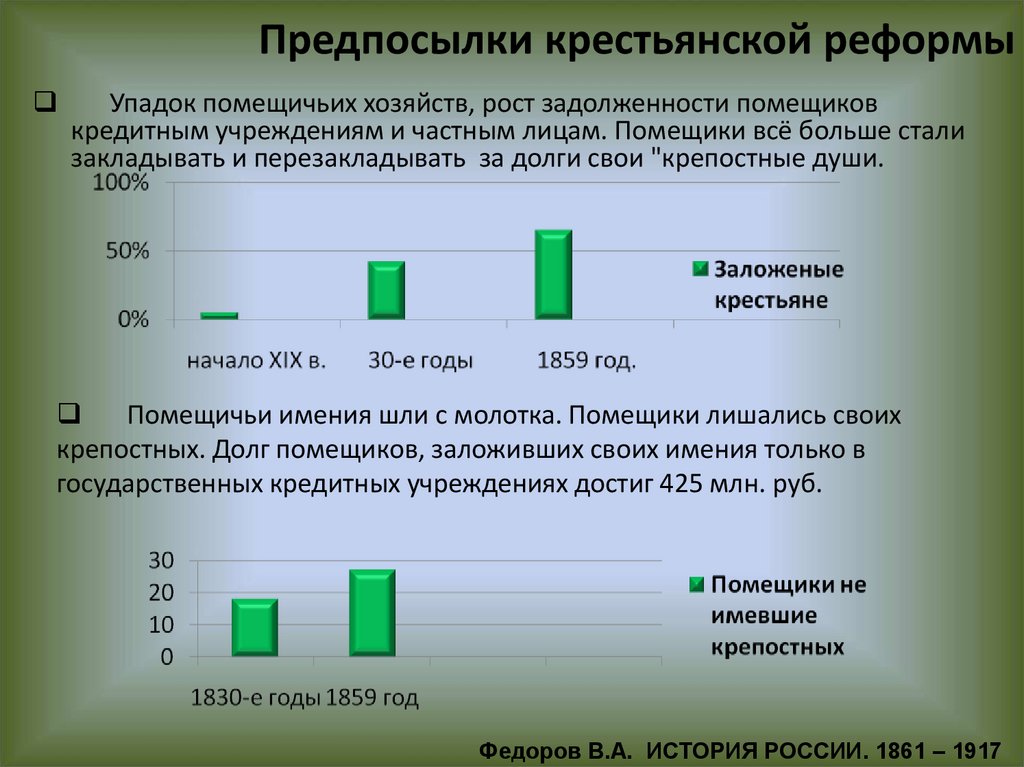 Упадок помещичьих хозяйств, рост задолженности помещиковкредитным учреждениям и частным лицам. Помещики всё больше стали