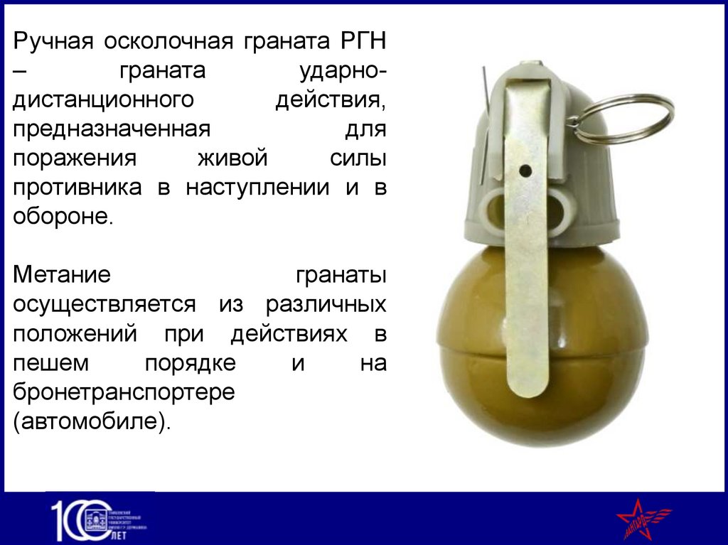 Ручные осколочные гранаты РГН и РГО состоят из корпуса, зарядавзрывчатой смеси, детонационной шашки и запала. Корпус РГН