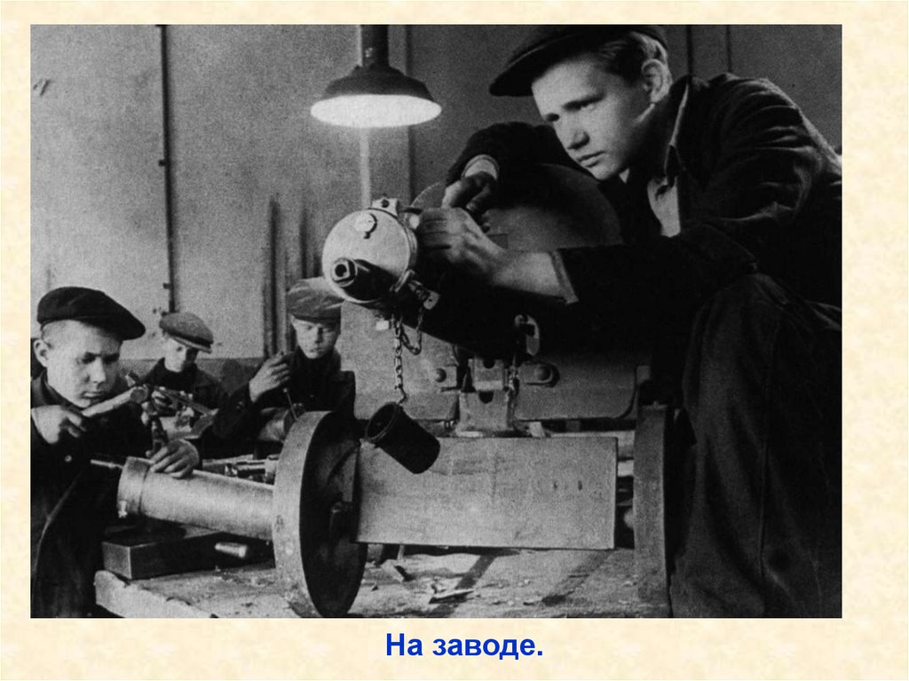 Опустели цеха ленинградских заводов. Многие рабочиеушли на фронт. К станкам встали их жёны и дети.